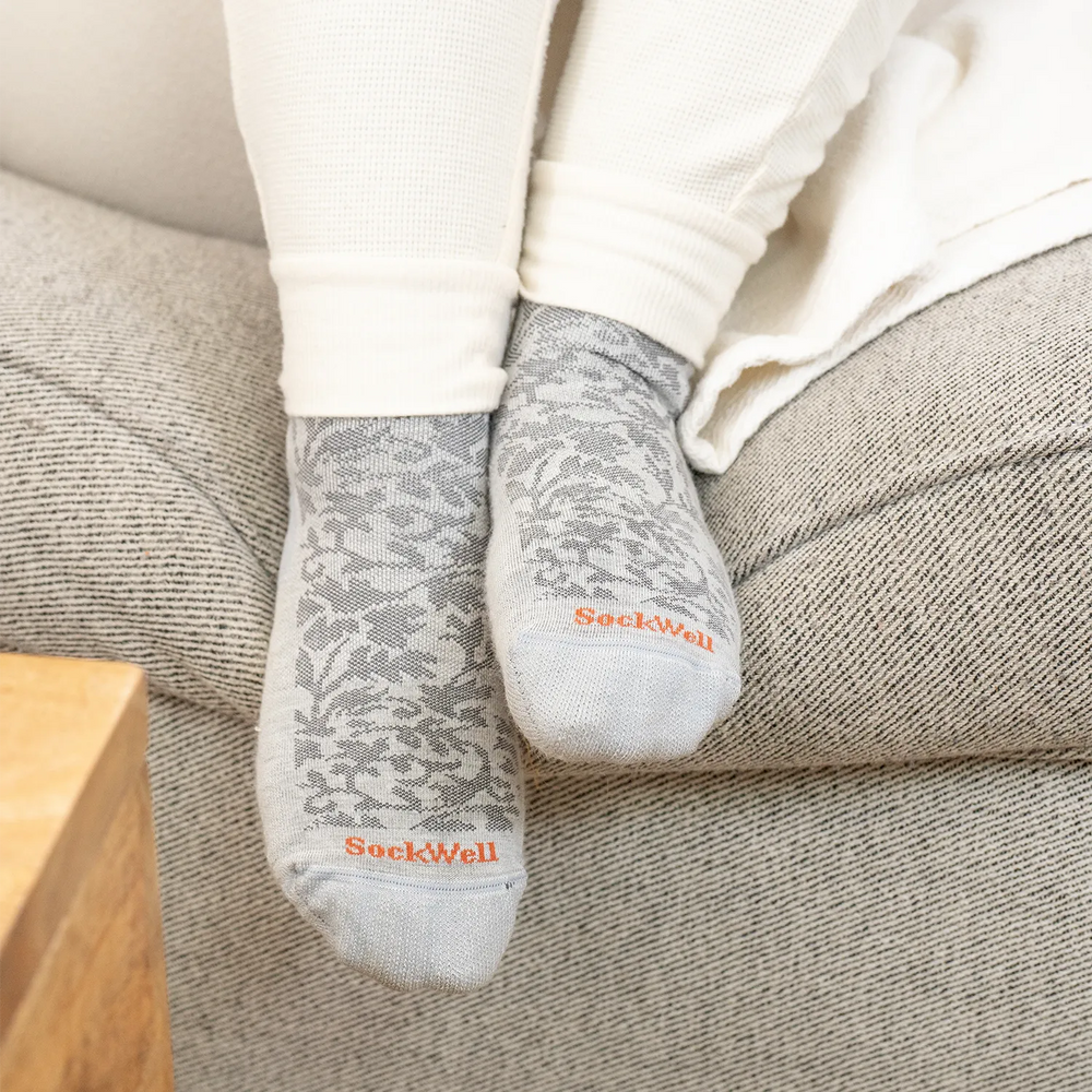 Deze Sockwell Damask in de kleur Oyster is een klasse 1 compressiekous voor dames. De lichte compressie in de sok helpt de bloedcirculatie optimaal te houden om het gevoel van vermoeide benen en opgezwollen enkels te voorkomen. De natuurlijke materialen staan garant voor veel draagcomfort.